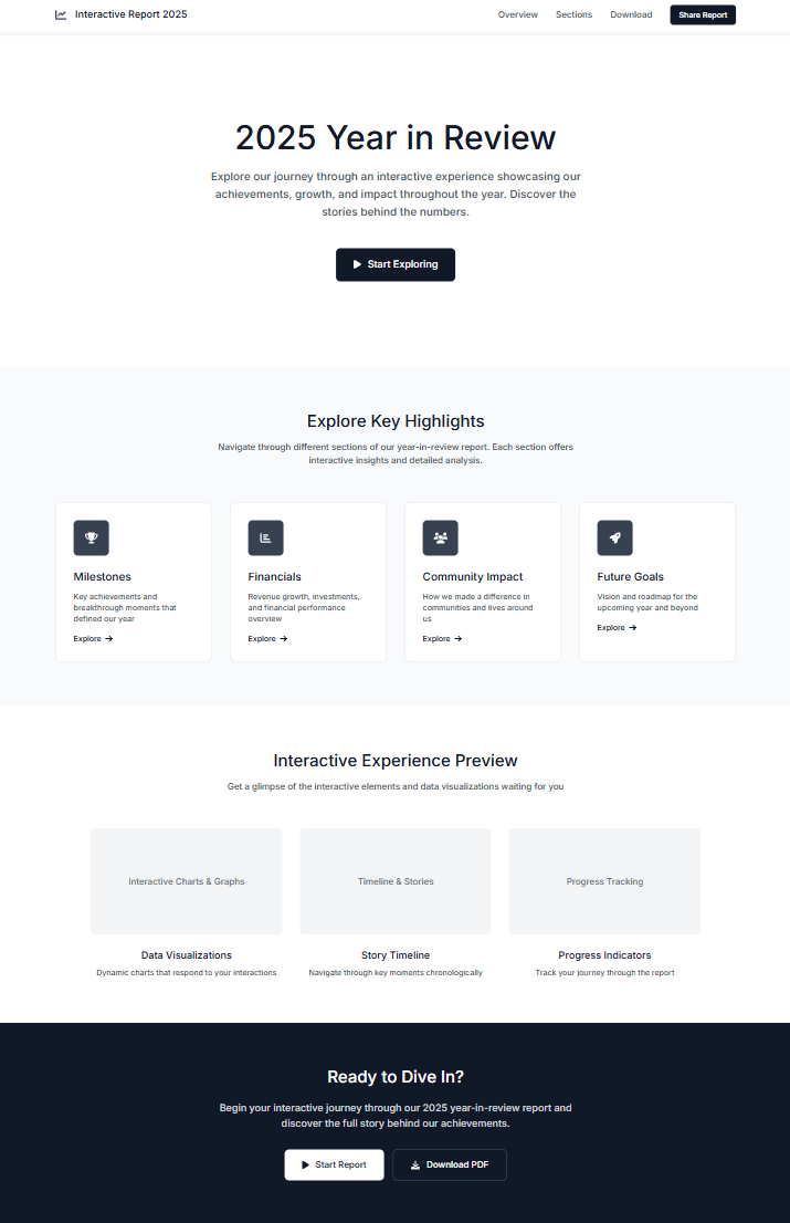 Traditional PDF-based annual reports failed to engage the audience, resulting in low retention of key data and limited interaction with the content. The challenge was to create a web-based, interactive experience that transformed dense data into an engaging, visually rich, and accessible story.